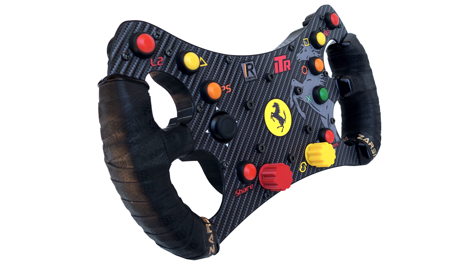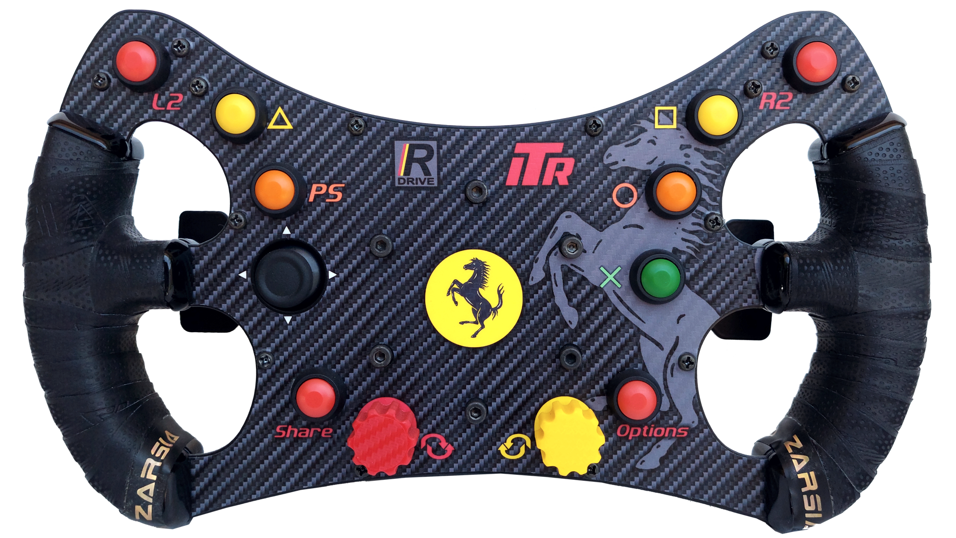 O volante R-Drive é compatível com bases Thrustmaster T300. Todos os botões e encoders são funcionais em PC, PS3, PS4 PS5. Não requer adaptações, sendo sua conexão no padrão original da base, sem fios adicionais externos.